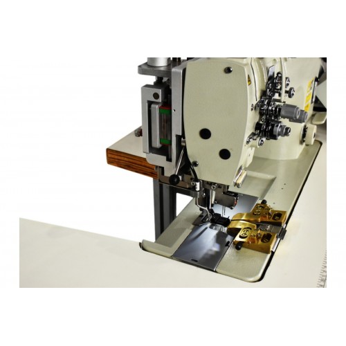 Автоматизированное решение на базе двухигольной машины с игольным продвижением, прямым приводом, позиционером иглы, автоматической обрезкой закрывающей тесьмы. Машина предназначена для закрытия шва стачивания клиньев бейсболки, кепки.