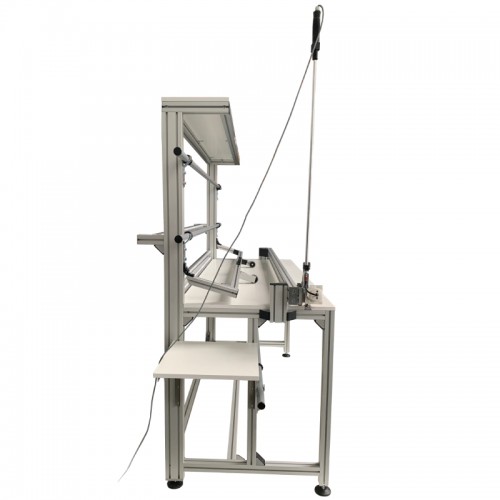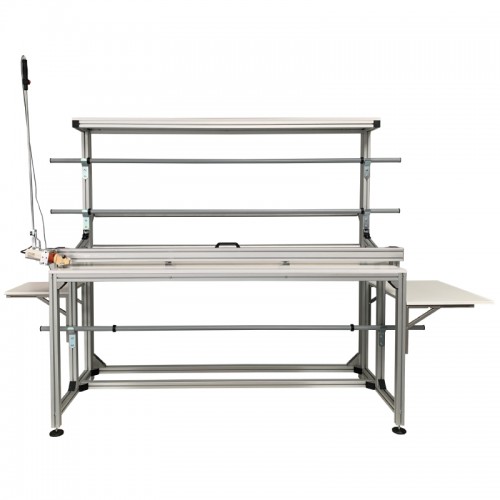 Стол оснащен зажимом с роликами, который удерживает пленку во время разматывания, что позволяет упаковывать элементы мебели безопасно и эффективно. Он также оснащен круглым электрическим ножом Great Ocean RSD-65 для резки пленки, который управляется вручную.