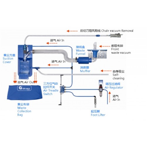 Дополнительное устройство для всасывания пыли, ниток и обрези ткани GRAND GA 112-1-D-F не требует от оператора никаких особых навыков управления, т.к. автоматически включается при нажатии на педаль.