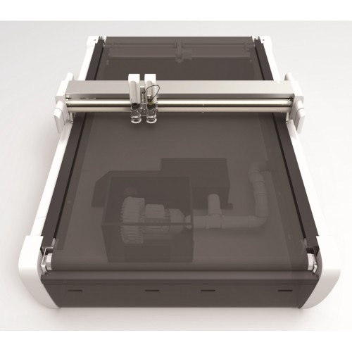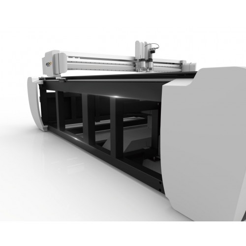 Плоттер оборудован зубчато-ременной передачей, оснащен многозонным вакуумным столом со столешницей из прочного авиационного алюминия. Взаимно изолированные плотные ячейки сотовой панели компенсируют нагрузку на рабочий стол, обеспечивая абсолютную плоскостность рабочей поверхности даже при ее больших размерах. Зонированная система вакуумного прижима дает возможность включать те зоны, которые необходимы.