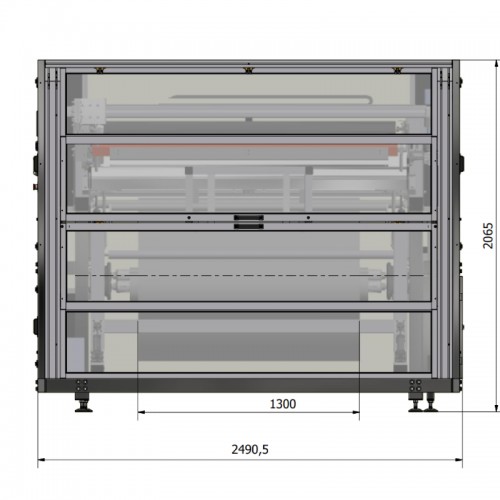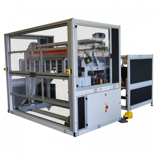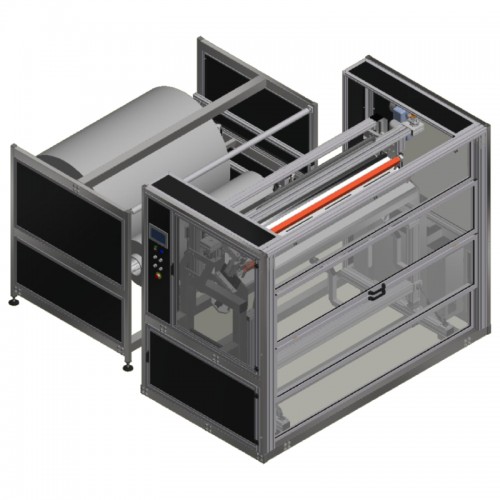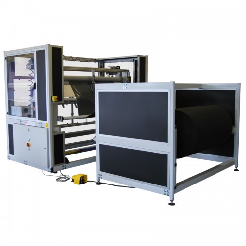 Машина для нарезки отрезков материала (с использованием механического или ультразвукового ножа) как тканевого, так и нетканого материала с шириной рулона до 2000 [мм] и длиной до 50 м. Диаметр рулона материала не может превышать 1000 мм. Машина состоит из двух частей: Размотчик состоит из двух подающих валов. Рабочая часть состоит из столешницы и ведущего вала со счетчиком. Эти два устройства позволяют резать панели материала на заданную длину. Рабочая часть оснащена двусторонней прижимной планкой для фиксирования материала во время резки. Отрезки материала могут быть автоматически повешены на специальную выдвижную вешалку. Вешалка может брать материал лицо к лицу или поочередно.