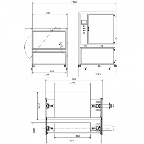 Технические характеристики машины включают рабочее давление 6 атм, максимальную ширину рулона 2000 мм, максимальный диаметр рулона 1000 мм, максимальный вес рулона 120 кг. Питание машины осуществляется от сети 230 В, а ее вес составляет 560 кг.