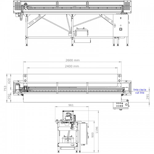 Технические характеристики машины включают ширину резки до 2400 мм, ширину столешницы 2600 мм и длину столешницы (длину стола после линии резки) 420 мм. Общая ширина устройства составляет 3240 мм, а общая длина - 755 мм. Высота столешницы - 900 мм. Скорость резки можно регулировать в диапазоне от минимальной (0,3 м/с) до максимальной (0,5 м/с). Лезвие вращается со скоростью 4000 об/мин и имеет диаметр 108 мм. Машина работает от электропитания 230 В и имеет мощность 700 Вт. Ультразвуковой нож в данной модели отсутствует, но присутствует круговой нож. Прижимная планка оснащена пневматическим механизмом и имеет одностороннее действие.