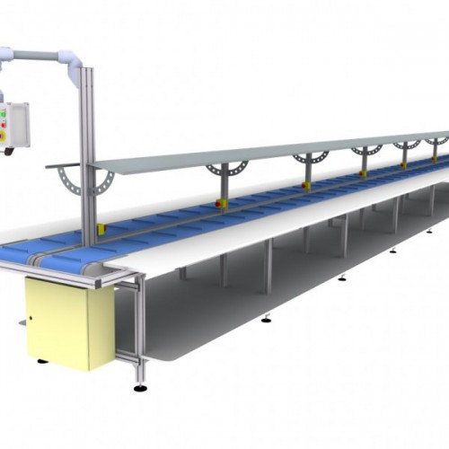 Конвейер LMK-1 был разработан для того, чтобы ускорить процесс сборки карнизов для штор. Переменная скорость конвейеров повышает эффективность производства на рабочем месте.