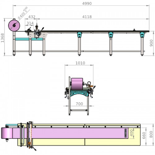 Технические характеристики стола включают общую длину стола 4990 мм, длину стола за линией реза 4118 мм, ширину столешницы 800 мм, ширину резки 600 мм, максимальный диаметр рулона ткани 1420 мм и максимальный вес рулона 40 кг. Ультразвуковой нож TTS-400 обеспечивает точную резку материалов.