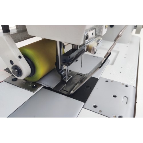 Двухигольная машина челночного стежка без отключения игл, с плоской платформой, с игольным и нижним транспортером, с дополнительными устройством подачи ленты с рулона, задним приводным пуллером и встроенным серводвигателем.