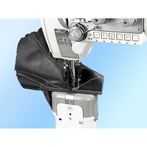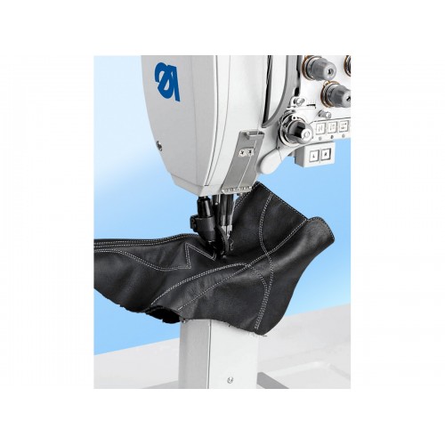 Двухигольная колонковая машина двойного челночного стежка со встроенным прямым приводом постоянного тока, с роликовым продвижением и игольным транспортером, приводной лапкой-роликом (также при шитье назад), устройством обрезки нити, автоматическим подъемом прижимной лапки и автоматическим устройством закрепки.
