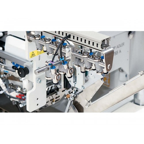 - Быстрая автоматическая регулировка зажимов с растяжением материала. Регулировка транспортных зажимов по ширине по отношению к подошве штемпеля осуществляется с помощью шагового мотора. Это позволяет автоматически осуществлять переход с кармана с двухсторонней обтачкой на карман с односторонней обтачкой.Также при этом можно включить функцию радвигания (натяжения) материала после опускания транспортных зажимов.