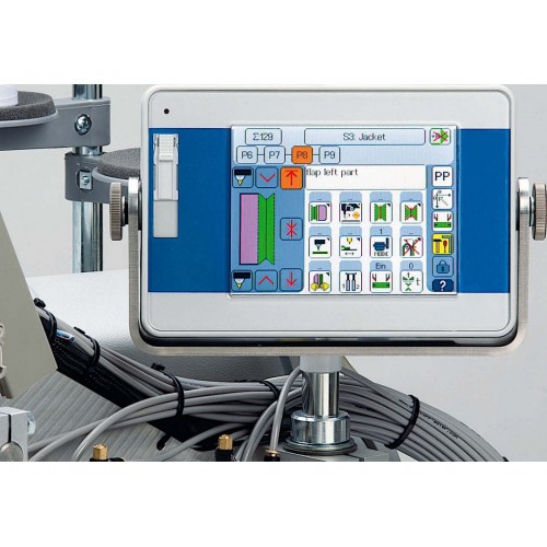 | Автоматические функции | Цветной графический дисплей OP 7000 для программирования 200 различных программ карманов, 40 последовательностей с максимум 8 возможными ячейками памяти, возможность программирования закрепки шва или уплотнения стежка, длины стежка, коррекции центрального и угловых ножей, скорости шитья и скорости продвижения материала. Датчик обрыва игольной нити. Датчик контроля остатка нити на шпуле. Копирование параметров машины через USB-накопитель. |