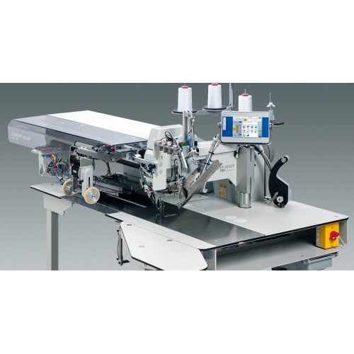 Durkopp Adler 755 S - Швейная установка для изготовления прямых или косых карманов в рамку, с клапаном или без клапана, с двухсторонней или односторонней обтачками. Укладка обтачек, клапанов, мешковин карманов производится вручную. Цветной графический дисплей OP 7000 для программирования 200 различных программ карманов, 40 последовательностей с максимум 8 возможными ячейками памяти, возможность программирования закрепки шва или уплотнения стежка, длины стежка, коррекции центрального и угловых ножей, скорости шитья и скорости продвижения материала. Языки D, GB, E, F, P, I, TR, CN, VN, RU, HI, BN, RU, BG, RO