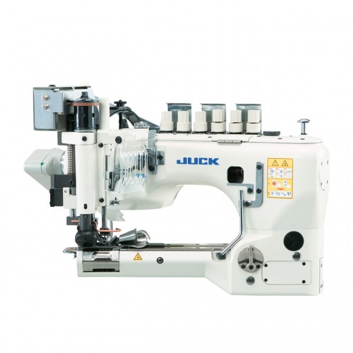Трехигольная машина двойного цепного стежка со «свободным рукавом». Обеспечивает великолепное качество шва «в замок». Подъем лапки 9 мм позволяет исполнять швы без пропусков и повреждения игл даже при использовании очень плотных материалов, сложенных в 16 слоев. В машине есть устройство, предотвращающее наматывание нити на кулачок нитепритягивателя петлителей, и устройство, предотвращающее повреждение петлителей. Машина выполнена с прямым приводом и «сухой» головой.