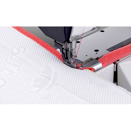 Специальная швейная головка двухниточного цепного стежка с нижним, верхним и игольным транспортом, с полуцилиндрической платформой, с пневматическим подъёмом лапки, для использования на установках для окантовки матрасов.