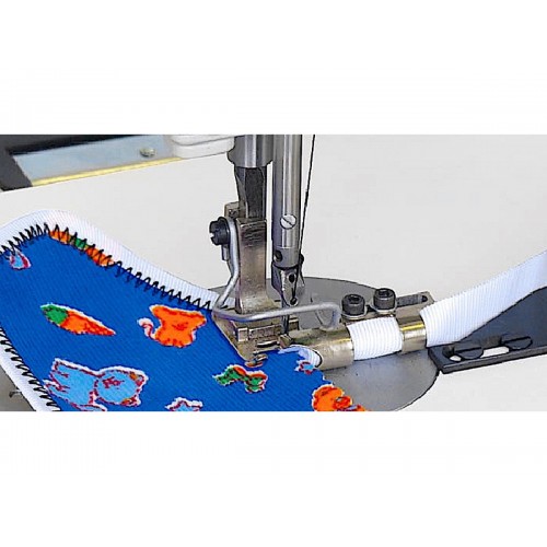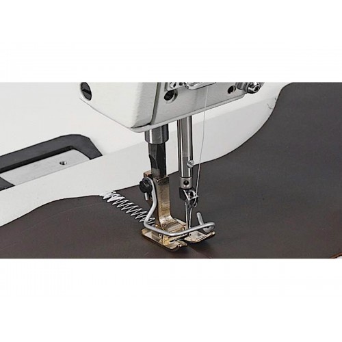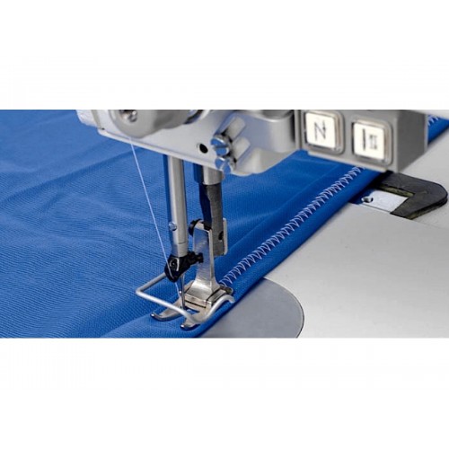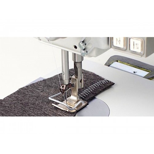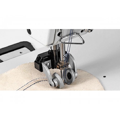 - Особенностью данной модели машины является возможность пошива лёгких и среднетяжёлых типов брезента, пошив при монтаже плоских фильтров и пошив текстильных материалов для технического использования. Машина без проблем прошивает материал толщиной 8 мм с использованием нитей до №15/3. Оборудована автоматическими функциями обрезки нити, закрепки и подъема лапки. Благодаря наличию дополнительных приспособлений машина может не только стачивать детали встык, но и выполнять окантовочные работы, пошив двумя иглами с прокладыванием тесьмы (жгута) снизу.
