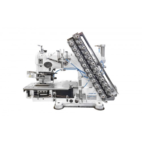 Промышленная швейная машина Jack JK-8009VCDII-12064P/UTL (комплект) - это 12-ти игольная машина с автоматикой для втачивания резинки в пояс брюк. Она оснащена приспособлением для передней натяжки пояса и встроенным серводвигателем с плавной регулировкой скорости.