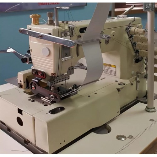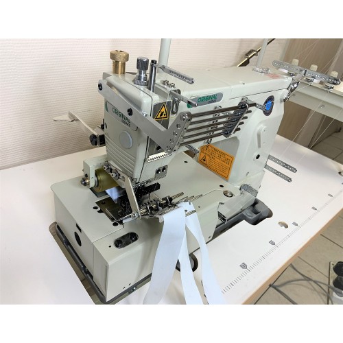 12-игольная швейная машина цепного стежка для настрачивания лампас и светоотражающей ленты с силиконовым задним пулером и направляющими приспособлениями для настрачивания лампас на спортивную одежду и другие трикотажные изделия и светоотражающей ленты на спецодежду. Приспособления и направляющие для притачивания 3-х лампас, шириной 9 мм или тесьмы, шириной 50 мм входят в комплект машины.