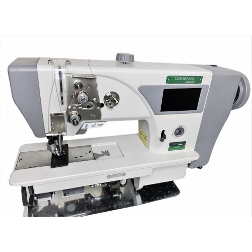 Одноигольная промышленная швейная машина челночного стежка c верхним, нижним роликовым и игольным продвижением материала, встроенным энергосберегающим шаговым двигателем и панелью управления, с автоматическими функциями: обрезки нити, подъема лапки, закрепки и позиционирования иглы.