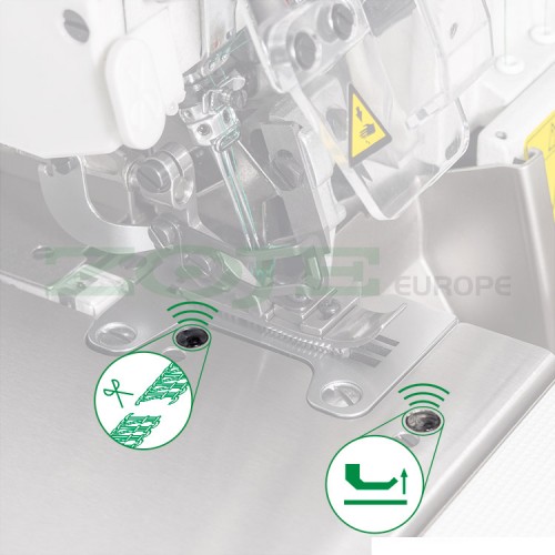 Оверлок оборудован двумя датчиками, отвечающими за подъем прижимной лапки в начале шитья и за автоматическую обрезку нити. Это значительно ускоряет работу с машиной.