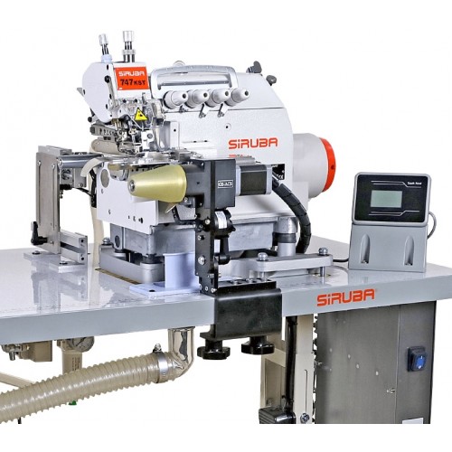 Автоматизированная рабочая станция на базе краеобметочной машины с цилиндрической платформой и верхним продвижением 747KST-514M-3-24VT с пневматическим фиксатором краев и роликами натяжения резины с функцией автоматического позиционирования тесьмы. Предназначен для выполнения операции втачивания горловины.