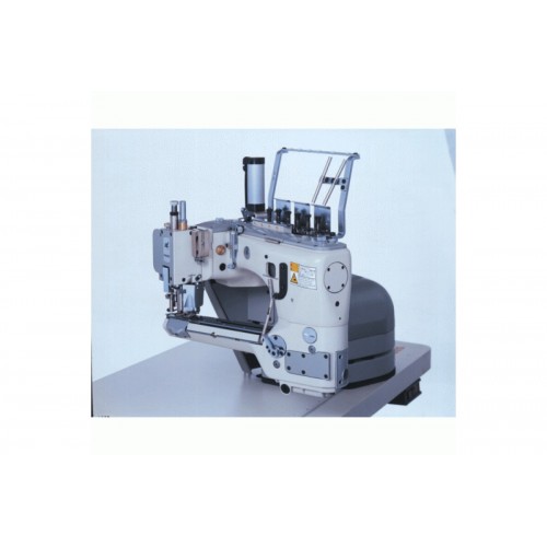 Четырехигольная шесьтиниточная плоскошовная машина (флетлок, Flatlock) со свободным рукавом, двухсторонней обрезкой края материала и устройством автоматического подъема лапки.