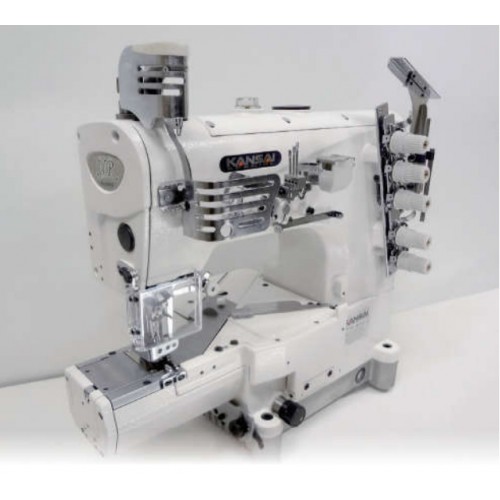Трехигольная высокоскоростная плоскошовная машина с автоматикой Kansai Special NR-9803GCC-UTE с верхним и нижним застилом и цилиндрической платформой применяется для распошивания оверлочных швов изделий на изделиях из трикотажа, средних и легких тканей.