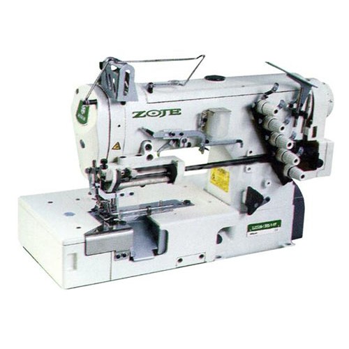 Трехигольная пятиниточная машина с прямым приводом и плоской платформой, с дозирующим устройством подачи эластичной тесьмы (резинки) механического типа