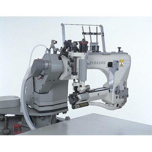 Трехигольная шестиниточная машина двойного цепного стежка со свободным рукавом состоящим из верхнего и нижнего железных роликов продвижения предназначена для выполнения операции "шов в замок" на рукавах и боковых швах рабочей, джинсовой одежды и других изделий из тяжелых и сверхтяжелых материалов.