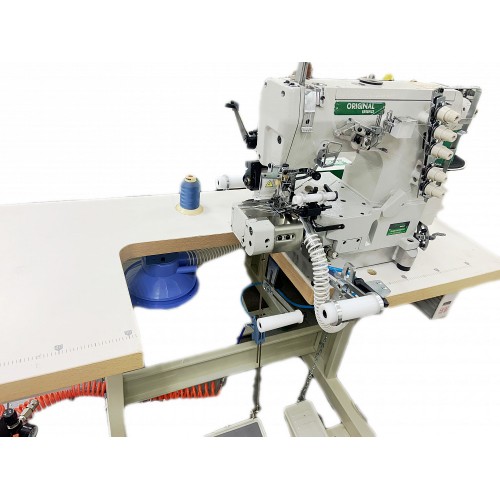 ORIGINAL OE-664D-33ACX-356/FT/RT/UT предназначена для пришивания резинки к поясу изделия. Поставляется с прямым, энергосберегающим приводом с позицией иглы, имеет задний пуллер, механизм растяжки (ролики) изделия для пристрачивания резинки к поясу, направляющий механизм и ролики для подачи резинки в зону шитья.