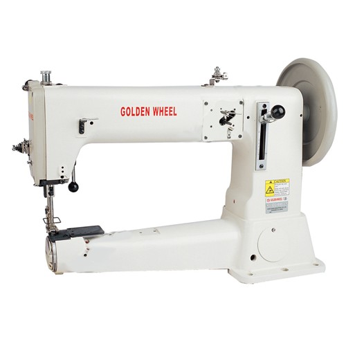 Рукавная швейная машина челночного стежка тройным (унисонным) продвижением (зубчатая рейка, шагающая лапка, отклоняющаяся игла) и увеличенным качающимся челноком для сверхтяжелых материалов.