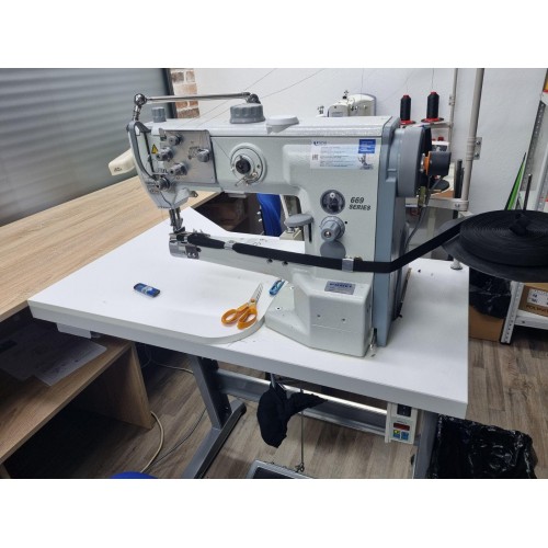 Одноигольная рукавная машина двойного челночного стежка с тройным продвижением (нижнее реечное, игольное и чередующиеся шагающие лапки). Подъем нижнего транспортера можно отключить для окантовочных операций.