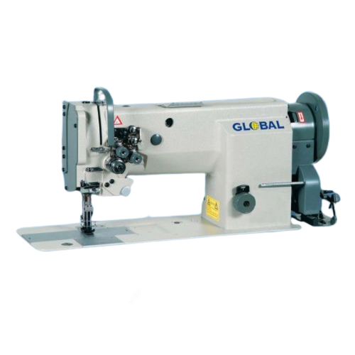 Двухигольная машина с тройным продвижением и увеличенными челноками для работы с тяжелыми тканями. Без отключения игл.
