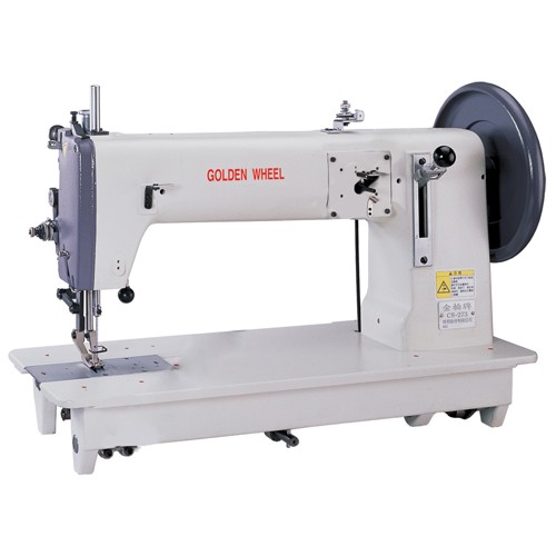 Одноигольная прямострочная машина челночного стежка с увеличенным челноком для тяжелых материалов.