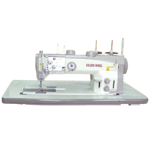 Одноигольная прямострочная машина челночного стежка с тройным (унисонным) продвижением с увеличенным челноком и удлиненной платформой для шитья тяжелых и сверхтяжелых материалов.