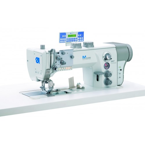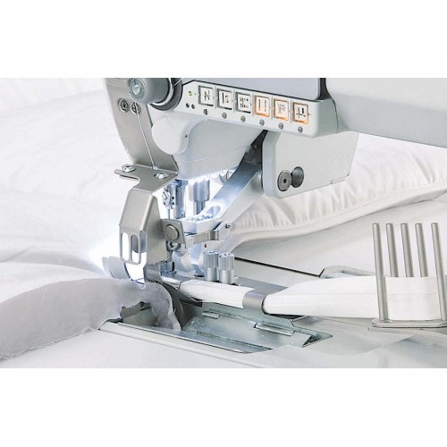 Одноигольная швейная машина двойного челночного стежка с интегрированным DA сервоприводом, тройным продвижением (нижнее реечное, игольное и чередующиеся шагающие лапки), подключаемым устройством обрезки кромки и шагающим окантователем, электромагнитным устройством обрезки нити, включаемым электропневматическим натяжением нити, встроенной 2-ой длиной стежка, электропневматической закрепкой шва и подъемом лапки, электропневматическим устройством быстрой регулировки подъема, челноком XXL, со встроенным светильником (светодиод), с большим вертикальным челноком (левосторонний) состоящим из двух частей, предохранительной муфтой, с автоматической адаптацией скорости. С индикатором контроля масла.
