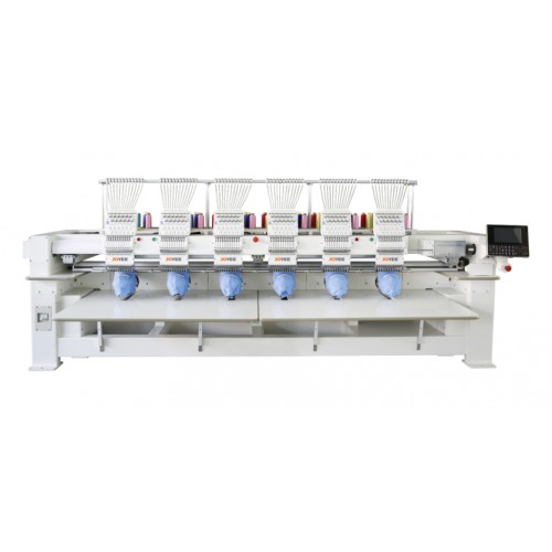 Шестиголовочная вышивальная машина на 12 игл (цветов). Выполняет вышивку высокого класса на различных видах материалов, включая кожу. Благодаря большому количеству голов эти машины идеально подходят для массового выпуска шевронов, а также для увеличения производительности. Вышивка производится как в пяльцах различного размера, так и в единой вышивальной раме.