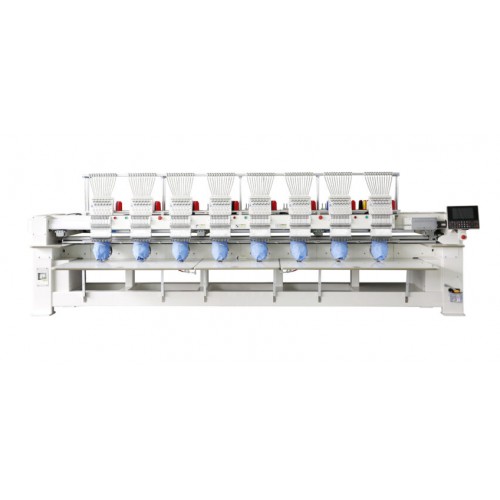 Восьмиголовочная вышивальная машина на 12 игл (цветов). Выполняет вышивку высокого класса на различных видах материалов, включая кожу. Благодаря большому количеству голов эти машины идеально подходят для массового выпуска шевронов, а также для увеличения производительности. Вышивка производится как в пяльцах различного размера, так и в единой вышивальной раме.